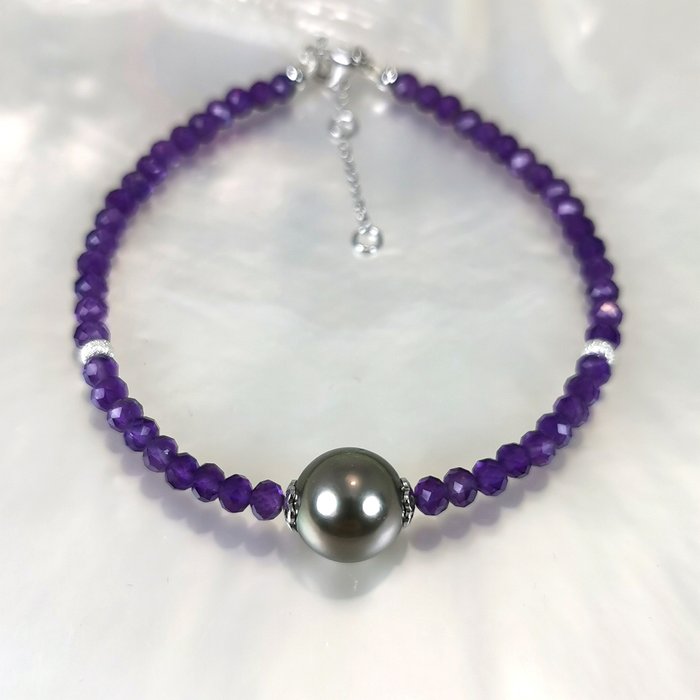 Mooie edelstenen armband in Zilver 925%o met 1 mooie ronde vorm Tahiti cultuurparel Afmeting Ø 10x11 MM met schitterende Amethisten rond gefacetteerd van Ø 3,5x4 mm. Lengte verstelbaar van 17 tot 21 cm.