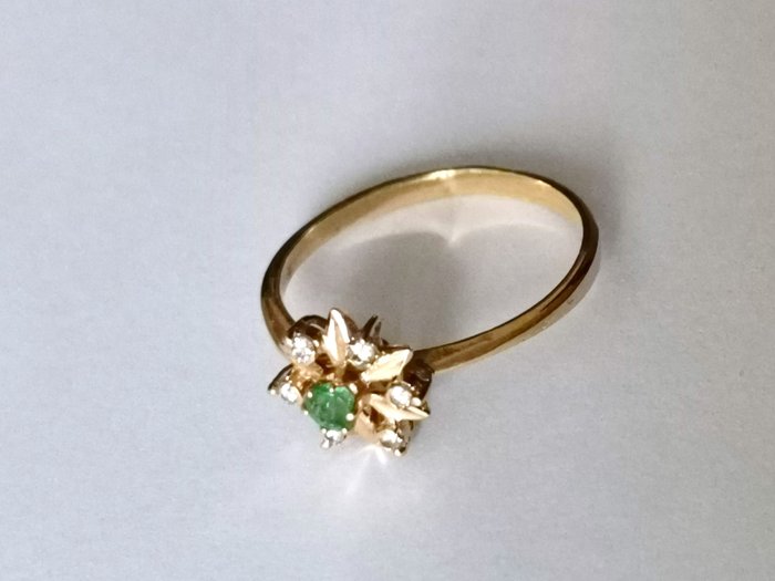 Mooie ronde gouden ring met smaragd en diamanten halo.