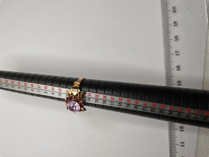 Kostbare en oude handgemaakte ring, geel goud met centrale roze steen, in klauwen.