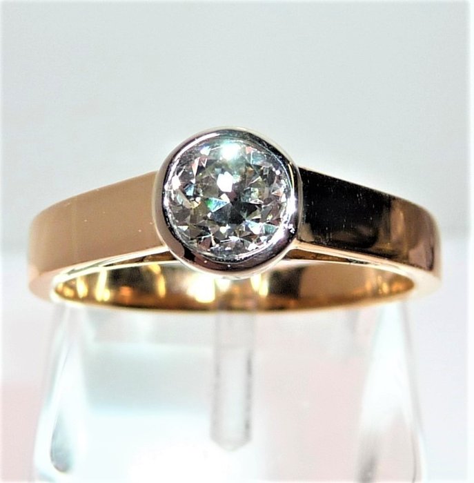 Ring van 750/ 18 kt geelgoud. De ringkop heeft een grote diamant gezet in een ronde bezelzetting. De bezelzetting omsluit de diamant als een ring en de diamant krijgt licht van opzij en van onderaf. De solitaire diamant heeft een overgangsslijpsel - een voorloper van de moderne briljantslijpsel. Daardoor heeft het een prachtige warme glans - zie foto's.
