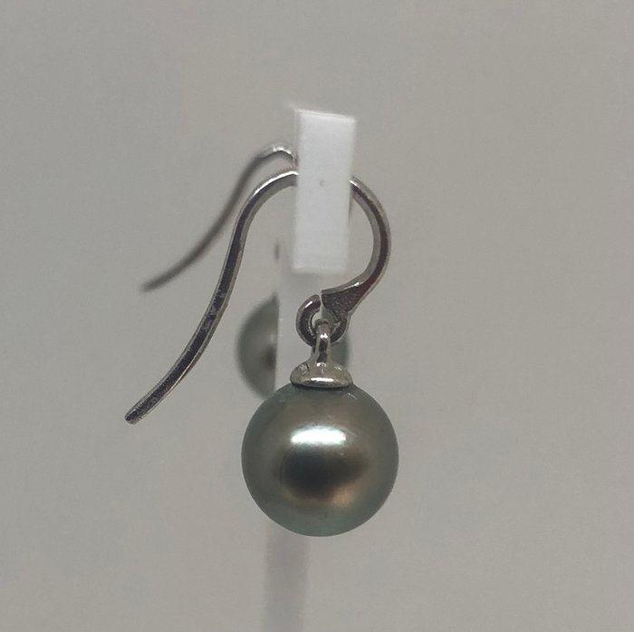 Prachtig paar oorbellen in Witgoud 18K met 2 gekweekte Tahiti parels - natuurlijke lichte aubergine kleur met groene tinten.