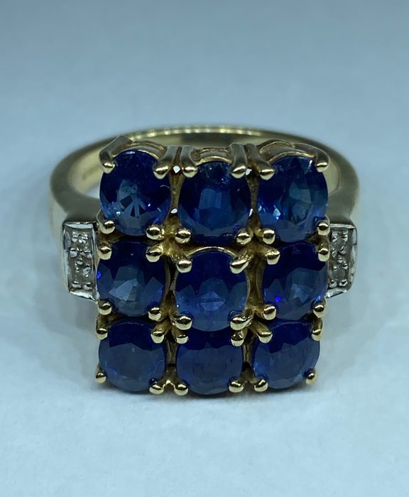 saffier en diamanten geelgouden ring. Deze ring bestaat uit 9 prachtig geslepen ovale saffieren 5x4mm aan weerszijden hiervan is een rij diamanten absoluut verbluffende ring goed gemaakt. volledig Hallmarked is professioneel gereinigd