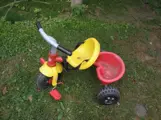 Driewieler met bakje en duwstang - kindje kan middels riempje vastgezet worden 12,50----------------driewieler met bakje - kindje kan middels riempje vastgezet worden 10,--