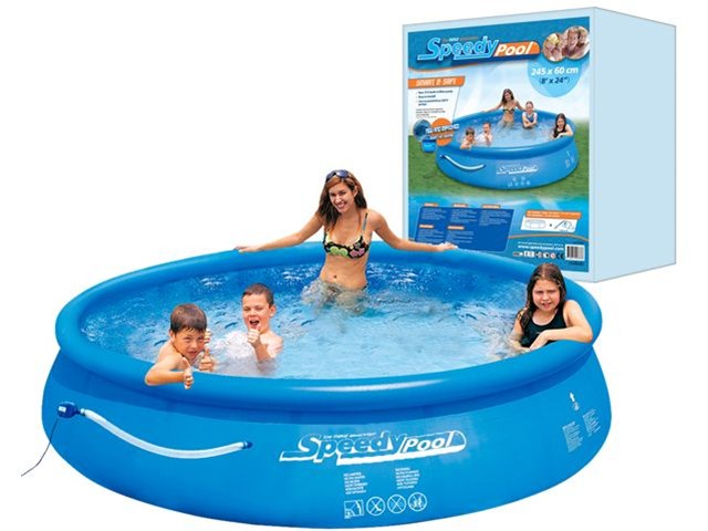 Zwembad Speedy Pool, met een afmeting van 245 x 60 cm. Voorzien van een vernieuwde ingebouwde pomp, 12 Volt. Doordat de pomp in het zwembad is ingebouwd, is het gebruik veel veiliger: nooit meer struikelen over losse slangen ! De pomp heeft een doorloopsnelheid van 1136 liter per uur. Het filter is zeer eenvoudig te vervangen. Het zwembad is vervaardigd van drielaags gerasterd PVC en is voorzien van een schroefventiel, om het bad gemakkelijk leeg te laten lopen. Vanaf 6 jaar, ex. btw