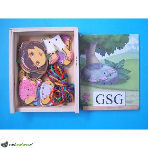 Dora figuren die je met behulp van een rijgtouw aan een plankje kunt rijgen. Er zijn verschillende outfits van Dora mogelijk.