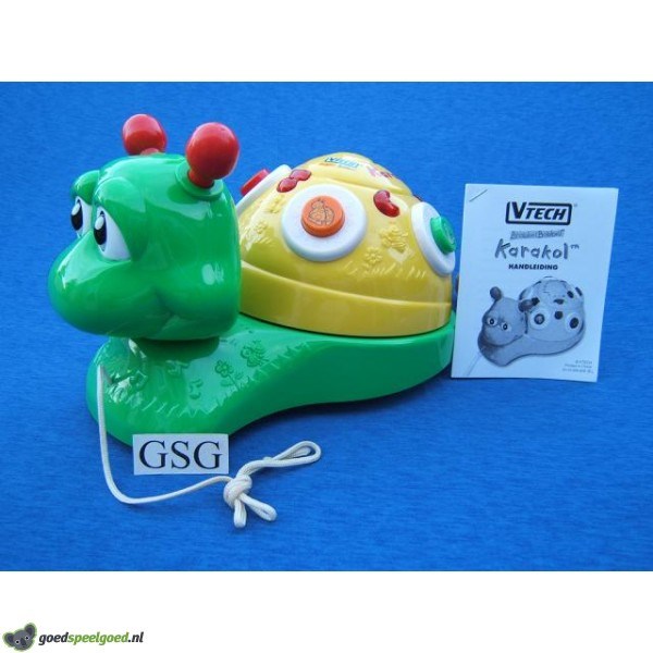 Trekkend aan het koord komt Karakol met vrolijke melodietjes en al ronddraaiend tot leven. Het slakkenhuis draait en de ogen en het hoofd bewegen vrolijk mee. Uw kind kan Karakol vol plezier en speels begeleiden door "eigenwijs" een of meer gekleurde druktoetsen in te duwen. Karakol maakt uw kind met 5 dieren bekend door de stem en de plaatjes op de toetsen. Uw kind heeft uren vol draaiend, sprekend en muzikaal speelplezier. Karakol speelt 10 verschillende melodietjes, te weten: Uit Artis is een beer ontsnapt, Moeder mag ik mee, Wat hangt daar aan een draad?, Een spinnetje een spinnetje, Wat hoor ik toch wat hoor ik toch, Hoofd schouder knie en teen, In Holland staat een huis, Hansje pansje kevertje en Berend botje ging uit varen. Kompleet met batterijen en een handleiding. Geschikt voor de leeftijd van 6-48 mnd. Werkt op 2 AA batterijen.