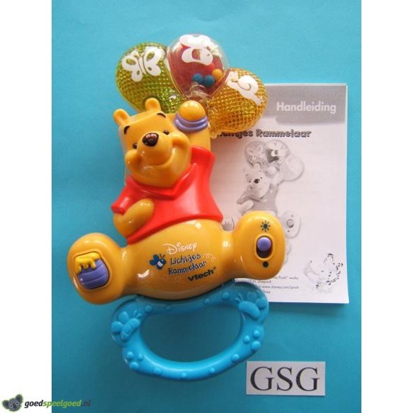 Kijk naar de lichtjes-ballonnen en leer kleuren met Winnie de Poeh. Deze interactieve rammelaar is geschikt voor de allerkleinsten. Het handvat is speciaal ontwikkeld voor de kleine babyhandjes. Beweeg de rammelaar en druk op de honingpot-toets voor leuke zinnnetjes, grappige geluidjes en vrolijke melodietjes. Luister naar Poehbeer die een liedje zingt en rammel en babbel maar mee. Kompleet met batterijen en handleiding. Geschikt voor de leeftijd vanaf 3 maanden. Werkt op 2 AAA batterijen.