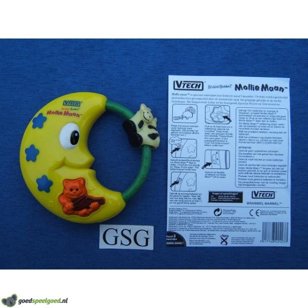 Uw kind zal zich amuseren met het bewegende figuurtje en het knipperende lichtje op Mollie maan. Ze speelt verschillende melodietjes. Onder andere: Slaap kindje slaap en Poesje mauw kom eens gauw. Het poesje knippert vrolijk mee met de muziek. Kompleet met batterijen en een handleiding. Geschikt voor de leeftijd van 3-36 mnd. Werkt op 3 knoopcel batterijen AG13.