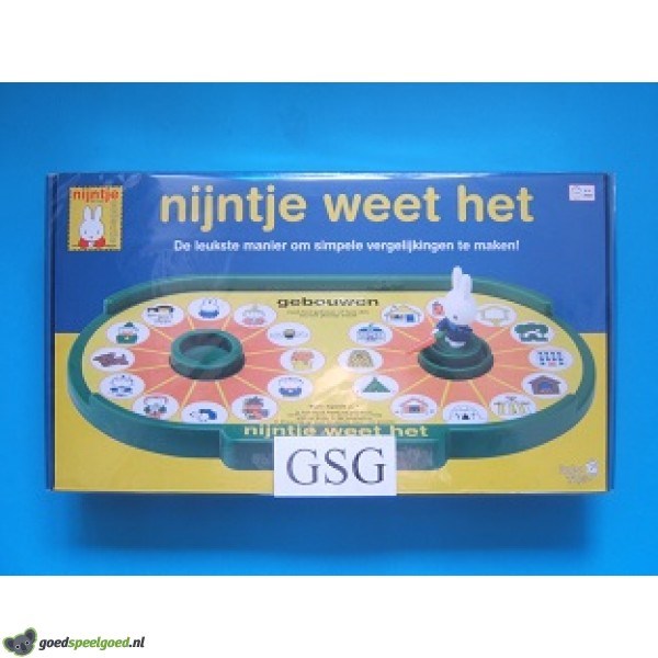 Nijntje weet het! Zet een Nijntje op het spelbord, aan de linkerkant met vragen, en plaats een Nijntje op de rechterkant met antwoorden. Nijntje wijst aan welk antwoord goed is! Met 5 dubbel bedrukte kaarten: in totaal 120 vragen en antwoorden. Verpakt in een full-colour doos. Kompleet met handleiding. Geschikt voor 1 of meer spelers in de leeftijd vanaf 4 jaar. Zit nog in de ongeopende originele verpakking.