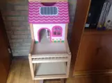 poppenhuis , hout- afmeting:Breedte 50, nok hoogte 56. Diepte 30- wat meubeltjes , hout - 27,50- kastje met bergruimte om het poppenhuis op te zetten 10,-