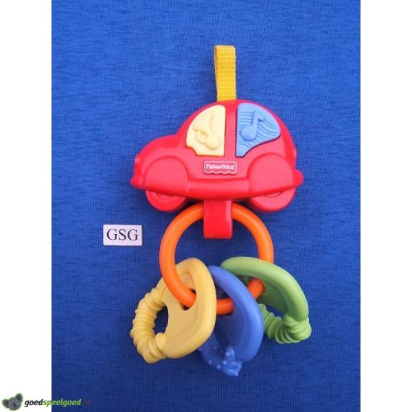 Leuke rammelaar in de vorm van een auto met verschillende geluidjes. Kompleet met batterijen. Werkt op 3 knoopcel batterijen AG13.