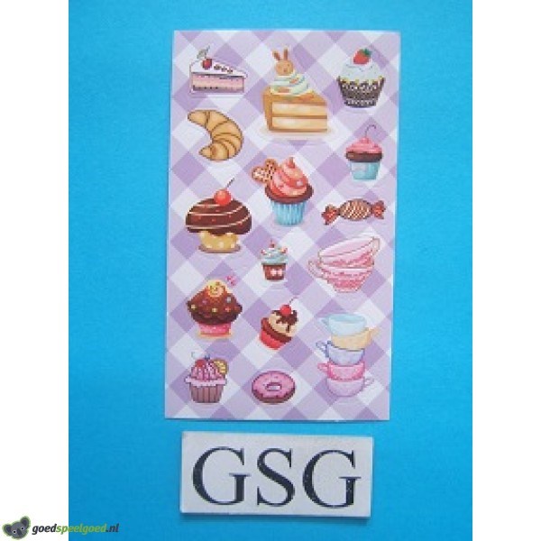 Stickervelletje met 15 stickers die betrekking hebben op het thema cupcakes. Let op achtergrondkleur kan variëren.