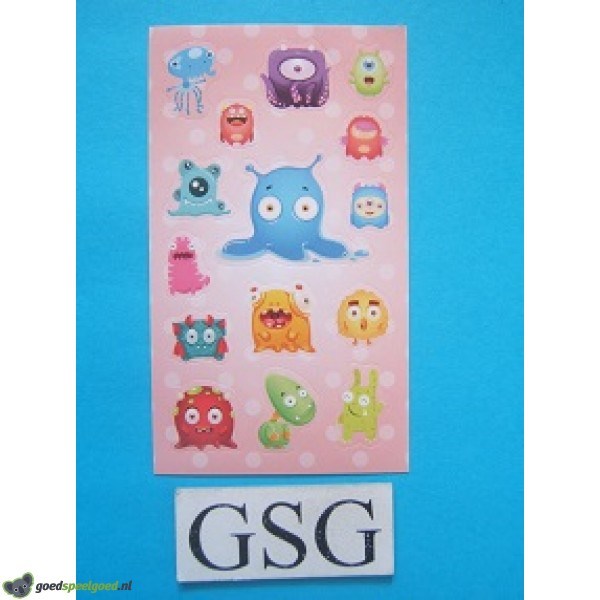 Stickervelletje met 15 stickers die betrekking hebben op het thema monsters. Let op achtergrondkleur kan variëren.