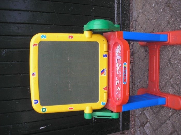 tekenbord- 6,50 per stuk- foto 1 - bakje voor de kleurtjes - inklapbaar als tafeltje te gebruiken - stevig i.p.st.- Foto 2 - bakje voor de kleurtjes - 1 kant tekenbord, andere kant magneetbord - stevig i.p.st.