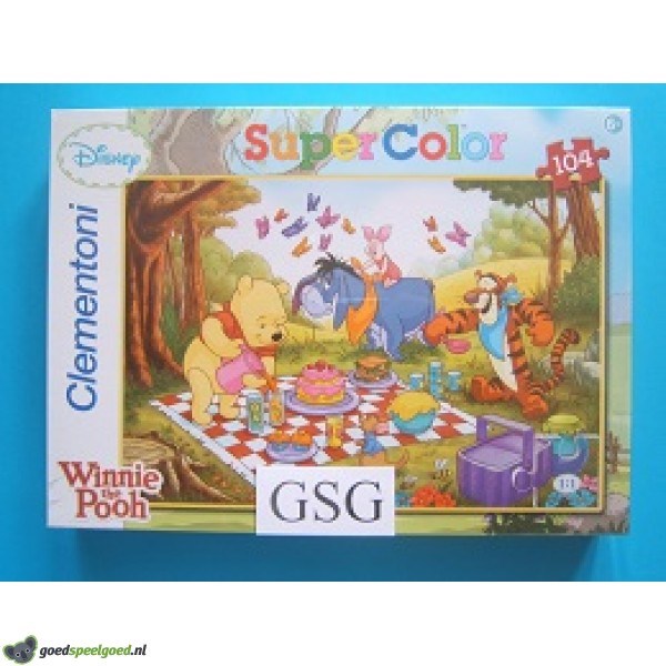 Puzzel van 104 stukjes met als thema Winnie the Pooh picknicken van het merk Clementoni. Zit nog in de ongeopende originele verpakking.