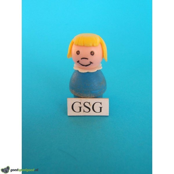 Blauw meisje met geel haar en een lachend gezicht. Dit houten poppetje kan overal bij de Play Family collectie gebruikt worden als aanvulling.