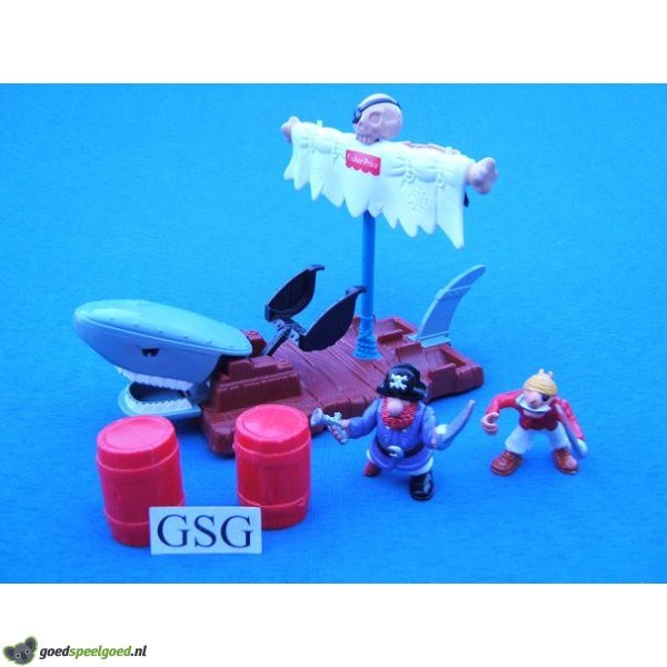 Enteren, pas op voor de piraten. Met hun piratenvlot met katapult kunnen ze tonnen wegschieten. Vanuit het kraaienest kan de piratenkapitein mijlen ver kijken. De twee piraten kunnen ook boven op het dwarshout van het zeil worden gezet. De mond van de haai voorop het vlot kan open en dicht.