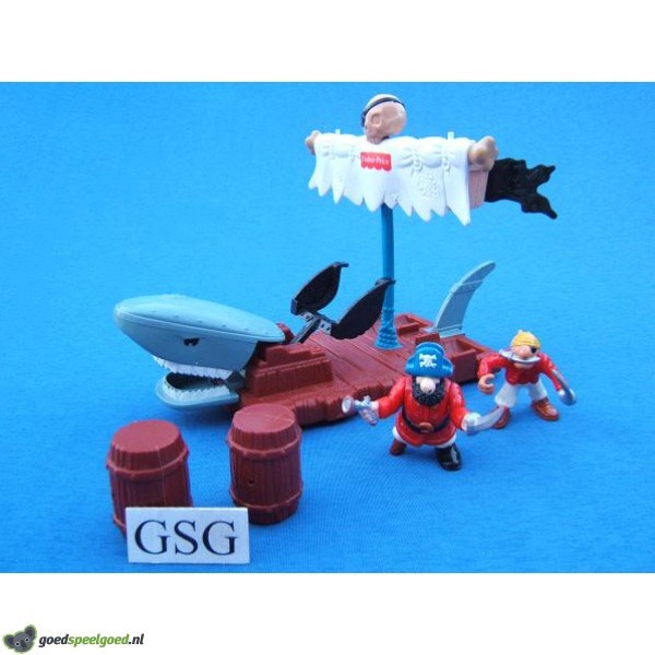 Enteren, pas op voor de piraten. Met hun piratenvlot met katapult kunnen ze tonnen wegschieten. Vanuit het kraaienest kan de piratenkapitein mijlen ver kijken. De twee piraten kunnen ook boven op het dwarshout van het zeil worden gezet. De mond van de haai voorop het vlot kan open en dicht.