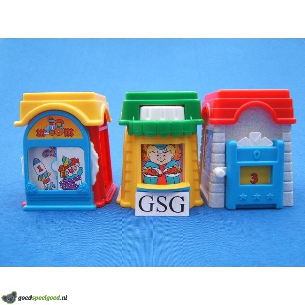 Set bestaande uit 3 huisjes die op elkaar gestapeld kunnen worden. Aan elke huisje zit ook een speeltje. Aan het rode huisje zit een draaischijf. Aan het gele huisje zit een raampje wat wegdraait. Aan het grijze huisje zit een schuif.