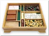 De doos bevat 'n spelbord (aan beide zijden van het deksel) en speelstukken voor: