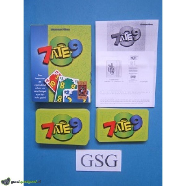 Chaotisch kaartspel, waarbij snel gerekend en gereageerd moet worden. Je krijgt een gedekte stapel kaarten en probeert die zo snel mogelijk kwijt te raken. Er ligt 1 kaart open op tafel. Daar staat een groot getal en een klein getal met een plusminteken op. De volgende kaart die gespeeld moet worden, is het grote getal plus of min het kleine getal. Daarbij wordt "om een hoekje" geteld. Zo is 9+2 bijvoorbeeld 1, en 3 - 4 bijvoorbeeld 9. Iedere speler mag nu één voor één en met maar 1 hand kaarten van zijn stapel trekken en eventueel spelen. Maar doe dat snel, want als een ander je voor is, ontstaat er weer een nieuwe som! Wie nog maar 1 kaart overheeft, mag deze gedekt op de stapel leggen en wint het spel! 7ATE9 is een gezellig en spectaculair kaartspel. Voor jonge kinderen heeft het rekenelement ook een educatieve werking. Kompleet met handleiding. Geschikt voor 2-4 spelers in de leeftijd van 8-99 jaar.