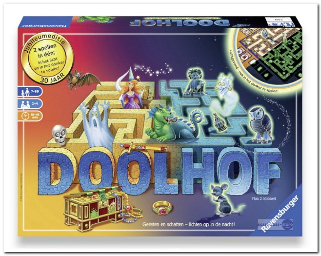 Doolhof - de Ravensburger klassieker met het magische spelbord. Al 30 jaar verschuiven miljoenen mensen de gangen en zoeken ze naar schatten. En nu kan je voor het eerst het doolhof ook in het donker spelen!