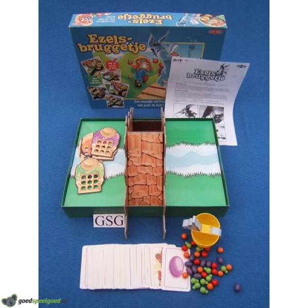 Het ezeltje is onderweg van de boerderij naar de grote markt. Op eigen houtje en eigenwijs als een echte ezel vertrekt hij zonder fruit. De spelers moeten proberen toch met zoveel mogelijk fruit de markt aan de overkant van de brug te bereiken. Door kaarten uit te spelen mogen de spelers het mandje volpakken met fruit, de brug opbouwen of de andere spelers tegenwerken. Wie het meeste fruit in het mandje heeft als het ezeltje de overkant van de brug bereikt, is de winnaar van het spel. Kompleet met handleiding. Geschikt voor 2-4 spelers in de leeftijd vanaf 6 jaar.
