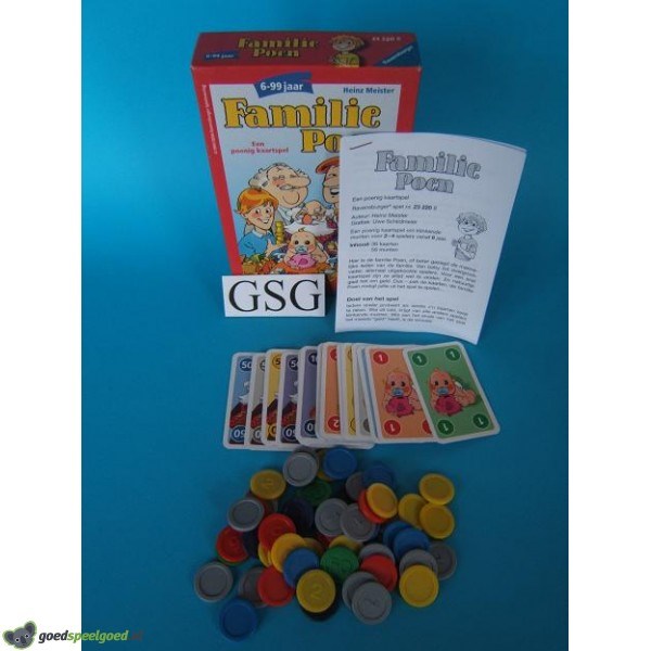 De familie Poen nodigt jullie uit om mee te spelen. Wie met geluk en tactiek als eerste zijn kaarten kwijtraakt, wint veel geld. De kassa rinkelt, want de verliezers betalen contant. Kompleet met handleiding. Geschikt voor 2-4 spelers in de leeftijd vanaf 6 jaar.