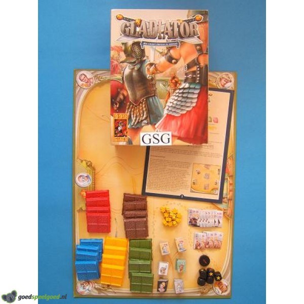 Rome is in verval. De schatkist van het eens zo machtige keizerrijk is nagenoeg leeg door voortdurende grensoorlogen en kostbare bouwprojecten. Om het volk rustig te houden, strooien megalomane Caesars met brood en spelen. In het enorme Colosseum worden spectaculaire en vaak bloedige schouwspelen gehouden. Favoriet zijn de duels tussen de machtige gladiatoren. In gladiator sturen de spelers meerdere ploegen de arena in om elkaar tot de dood te bevechten. Alleen de sterkste en sluwste krijgers zullen overleven. Dobbelstenen spelen een rol, maar de wijze waarop spelers hun gladiatoren opstellen en het duel aangaan zijn beslissend. Netwerpers kunnen tegenstanders al voor het treffen uitschakelen. Speerwerpers zijn snel en bepalen wie als eerste mag toeslaan. Zwaardvechters zijn erg belangrijk omdat ze de slagkracht vergroten. Schilddragers kunnen aanvallen afweren en verwondingen voorkomen. Harpoenvechters kunnen meerdere malen toeslaan. Ronde na ronde worden spannende duels uitgevochten. Succesvolle gladiatorploegen veroveren steeds meer terrein, maar aan het einde van het spel blijven alleen de allersterkste over. Kompleet met handleiding. Geschikt voor 2-5 spelers in de leeftijd vanaf 10 jaar.