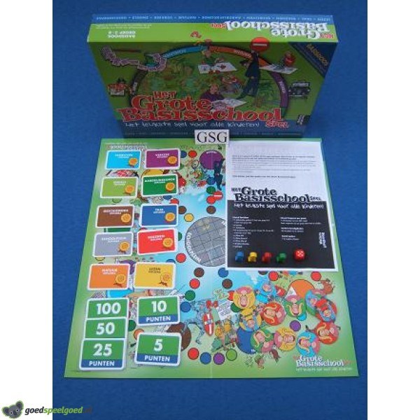 Dit is het enige, echte Grote Basisschool Spel. Met heel veel vragen over allerlei vakken. Leuk én spannend, wie is de beste? Speel het met je vriendjes of vriendinnetjes of met je broer of zus. Daag ook je vader, moeder, opa of oma eens uit. Jij weet vast meer dan zij. Je hebt heel lang plezier van het spel. Als je naar de volgende groep gaat, is er dus weer een nieuwe vragenset voor je. Deze zijn apart verkrijgbaar. Verzamel zoveel mogelijk punten. Je verdient die door de vragen goed te beantwoorden. En als je slim bent, kun je extra punten verdienen met de bluffiche en de blije juf. Of door zo snel mogelijk op het Schoolplein te komen. Maar kijk uit! Je verliest punten als je niet goed oplet. En de boze juf kan je nog aardig dwarszitten, Heb jij de meeste punten óf heb je als eerste alle diploma’s verzameld, dan ben je de winnaar. Per groep zijn er aparte vragensets verkrijgbaar met ruim 550 vragen, verdeeld over de belangrijkste vakken en algemene vragen uit het dagelijkse leven van kinderen. De vakken voor groep 3-4 zijn: lezen, taal, rekenen, schrijven, aardrijkskunde, natuur en verkeer. De vakken voor groep 5-8 zijn: lezen, taal, rekenen, schrijven, aardrijkskunde, geschiedenis, natuur, verkeer en Engels. Kompleet met handleiding. Geschikt voor 2-6 spelers in de leeftijd van 7-12 jaar.