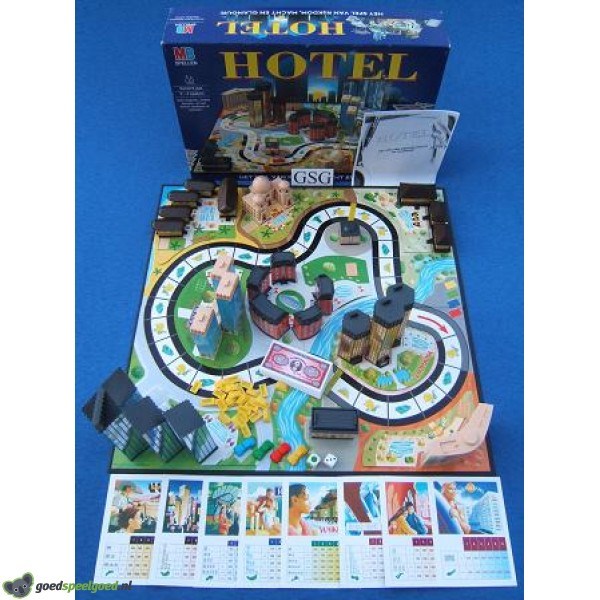 Het spel uit de luxe wereld van de grote hotels. Fortuinen worden gemaakt en verloren in dit spannende familiespel. Je vestigt een keten van hotels en probeert zo snel mogelijk rijk te worden. Wordt een rijke hotelmagnaat, bouw hotels, verwelkom je gasten en hoop dat ze nog meer uitgeven en dat ze zolang blijven dat ze hun rekening niet meer kunnen betalen. De speler die als laatste overblijft wint het spel. Let op! Doos en spel vertonen zichtbare gebruikssporen. Kompleet met handleiding. Geschikt voor 2-4 spelers in de leeftijd vanaf 8 jaar.