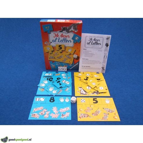 Met dit spel worden de kinderen spelenderwijs vertrouwd gemaakt met de cijfers 1 tot en met 10. Zo leren ze niet alleen tellen, maar ook hoe met behulp van dobbelsteenogen, cijfers en vingers, getallen afgebeeld kunnen worden. Kompleet met handleiding. Geschikt voor 1-4 spelers in de leeftijd van 4-7 jaar.