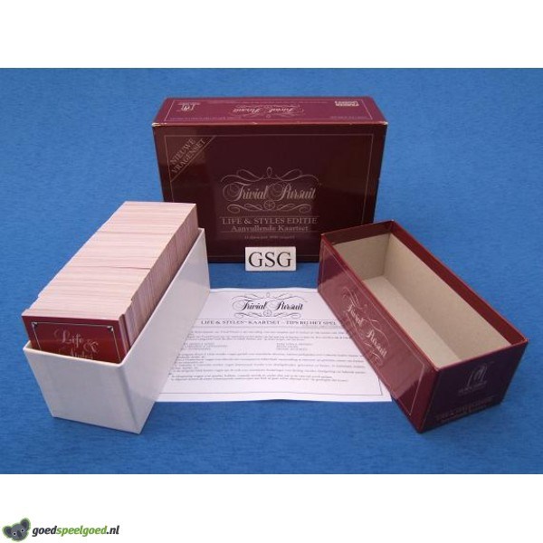 Aanvullende kaartset met 3000 vragen. Er zijn zes categorieën waarmee je met je tegenspelers moeten wedijveren, te weten: reizen & uitjes, gebruiken & gewoonten, eten & drinken, mode en algemeen & ontspanning. Deze aanvulset is alleen te gebruiken in combinatie met een gewone set. Kompleet met handleiding. Geschikt voor 2-36 spelers in de leeftijd vanaf 15 jaar. Doos is in iets mindere staat maar de kaarten zijn helemaal nieuw.