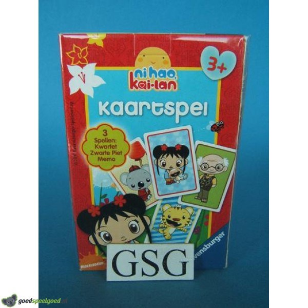 Drie spellen in één! Met de Ni Hao Kai-Lan kaarten kun je 3 verschillenden spellen spelen. Je kunt memory, kwartet en zwarte piet spelen, waardoor het niet eentonig blijft. De kaarten hebben afbeeldingen van de welbekende cartoon over de 5-jarige peuter, Kai-Lan. Kompleet met handleiding. Geschikt voor 1-4 spelers in de leeftijd van 3-8 jaar. Spel is nog helemaal nieuw.