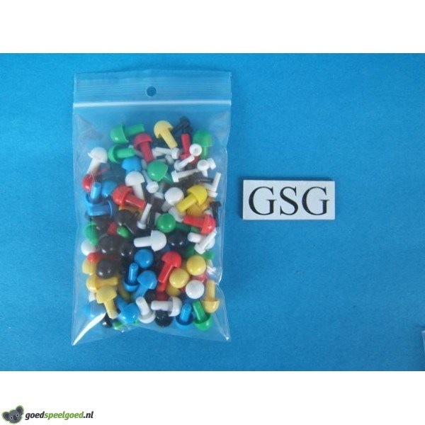 Set van gekleurde score pinnetjes. Te gebruiken voor verschillende spellen en onder andere voor de standaard Mastermind. Er zitten 6 verschillende kleuren (zwart, rood, geel, groen, blauw en wit) half-ronde pinnetjes in en zwarte en witte platte pinnetjes