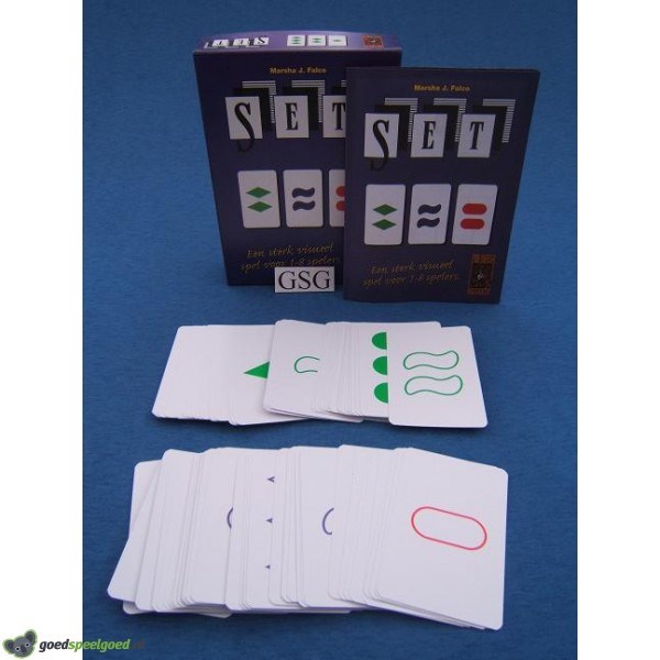 De 81 kaarten tonen symbolen die zich onderscheiden in kleur (rood, groen of paars), vorm (ovaal, rechthoek of golf), vulling (leeg, half gerasterd of vol) en aantal (1, 2 of 3 symbolen). Iedereen probeert zo vlug mogelijk drie kaarten te vinden die ‘samenhoren’. Dit zijn kaarten waar voor elk van de eigenschappen geldt dat ze of wel gelijk of wel verschillend zijn. Let op de volgende dingen: hebben de drie kaarten hetzelfde symbool, is de kleur telkens gelijk of verschillend, staan er steeds evenveel symbolen op of is de vulling telkens gelijk of verschillend? Enkel als elke vraag met een ‘ja’ kan beantwoord worden, vormen de drie geselecteerde kaarten een set. De speler die het eerst zo’n set ziet, krijgt de drie kaarten. Daarna worden er weer drie nieuwe kaarten op tafel geplaatst en gaat het concentratiespel verder. Er wordt gespeeld totdat alle kaarten gebruikt werden of niemand nog een set ontdekt. Wie nu de meeste sets bezit, wint het spel. Set is één van de beste combinatie- en concentratiespellen op de markt. Kompleet met handleiding. Geschikt voor 1-8 spelers in de leeftijd vanaf 6 jaar.