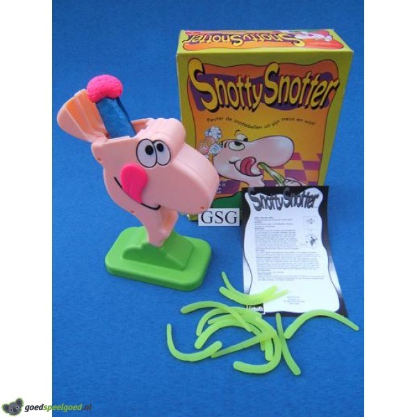 Snotty gaat uit zijn dak als jij die speciale snottebel uit zijn neus peutert. Kompleet met handleiding. Geschikt voor 2 of meer speler in de leeftijd vanaf 5 jaar.