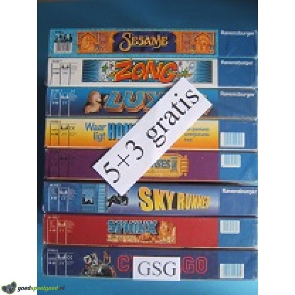 Acht Ravensburger spellen nu 5 + 3 gratis. Profiteer nu van de korting van 35 Euro op dit spellen pakket. In deze set zitten de spellen: Sesame, Zong, Luxor, Waar ligt Honolulu, Ramses II, Sky Runner, Sphinx en Chicago. De waarde van dit pakket is 100 € en daar betaald u slechts 65 € voor. De komplete set is door elkaar geschikt voor 2-6 spelers in de leeftijd vanaf 7 jaar.