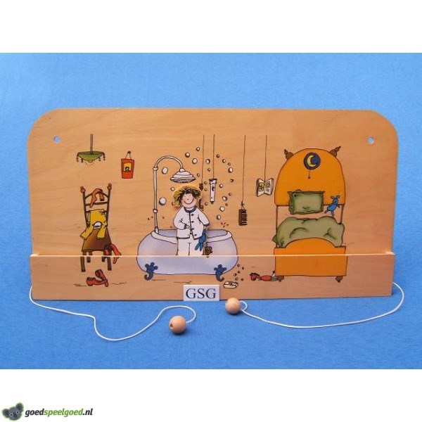 Als uw kind aan het touwtje trekt dan schuift het poppetje heen en weer. Hiermee kunt u uw kind aanleren wanneer het bedtijd is of wanneer het tijd om op te staan is. Geschikt voor de leeftijd vanaf 3 jaar.