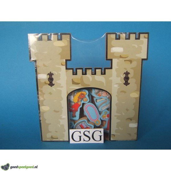 Houten kasteel met figuren. Er zitten bij: koning, prinses, heks, draak, eenhoorn, kroon, zwaard, ketting, schild, prinses, ridder en ridder te paard. Zit nog in de ongeopende originele verpakking.