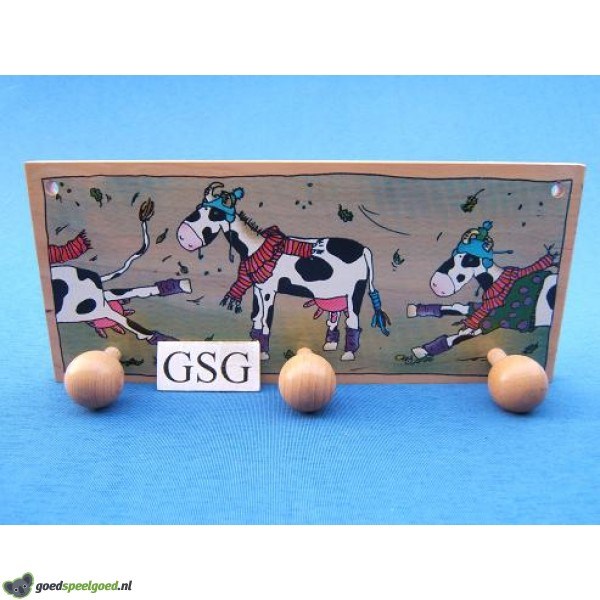 Leuke houten kapstok met drie ophanghaken waaraan uw kind haar of zijn jas aan kan hangen. De leuke koeien afbeeldingen maken de kapstok ook nog eens decoratief.