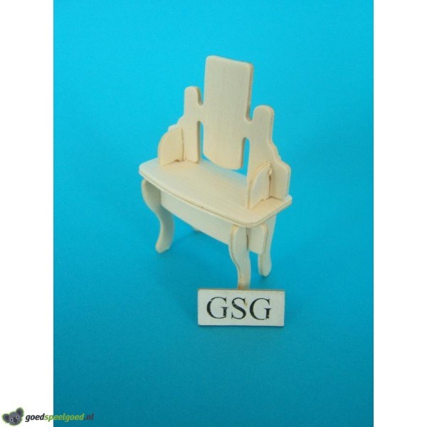 Gemaakt van hout en wordt als klein zelfbouw pakketje geleverd. Het is gemaakt van onbehandeld hout dat nog dient te worden voorzien van lak, beits, verf etc. indien men dit wenst. Qua maatvoering kan het eventueel noodzakelijk zijn om de onderdelen eventueel nog wat bij te schuren of licht aan te passen. Dit is mogelijk door gebruik te maken van wat schuurpapier of een mesje. Het kan in elkaar worden geschoven maar voor een vaste montage is het aan te raden om gebruik te maken van lijm zodat kleine kinderen het zelfbouw meubeltje niet meer uit elkaar krijgen. Montage daarom altijd onder toezicht van een volwassene.