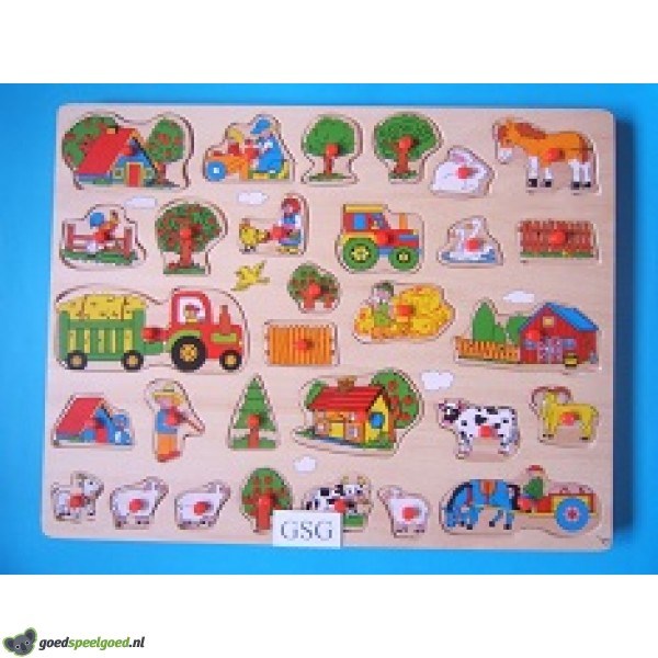 Houten legplankje met daarop alles wat je op de boerderij ziet.