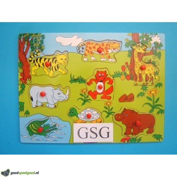 Houten legplankje met daarop verschillende dieren die in het wild leven. Is nog helemaal nieuw.