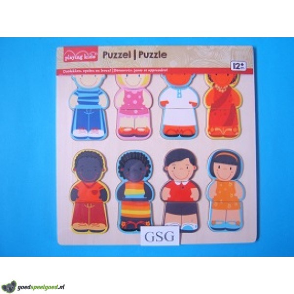 Houten legplankje met daarop allemaal kinderen in verschillende kostuums. Zit nog in de ongeopende originele verpakking.