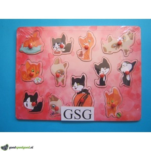 Houten legplankje met daarop allemaal verschillende poesjes. Zit nog in de ongeopende originele verpakking.