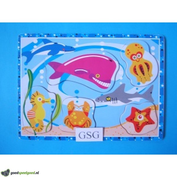 Houten legplankje met daarop allemaal verschillende soorten zeedieren.