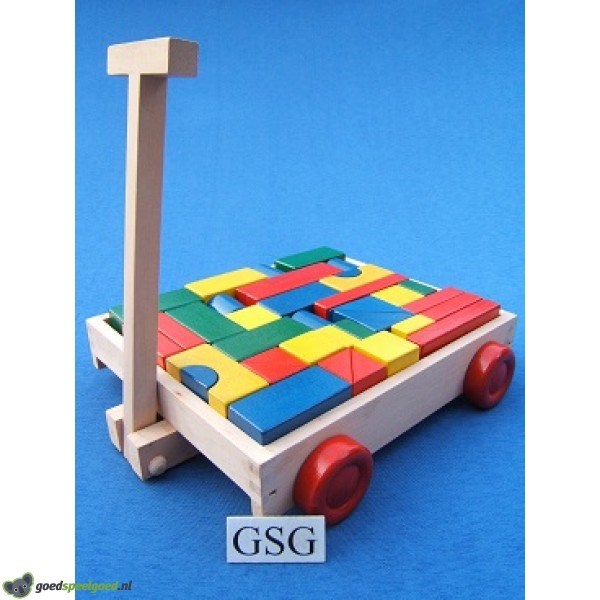 Houten trekkar met gekleurde blokken. Geschikt voor kinderen vanaf 3 jaar.