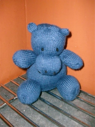 Gloria het nijlpaard is 21cm groot en gebreid in blauwe tricotsteek. Gloria heeft een klein staartje.
