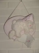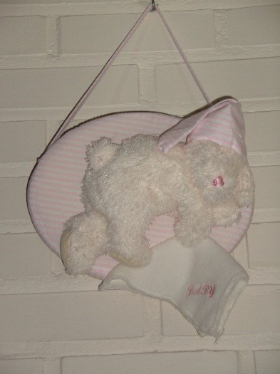 Op een houtenpaneeltje bekleed met stof, beer pluche en slab fleece met geborduurd Baby erop en voorzien van ophanglus.